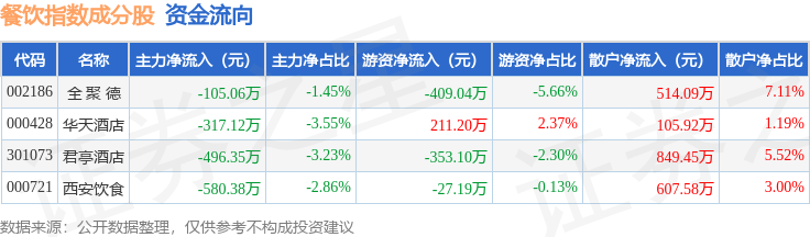 资金流向方面,餐饮指数(399238)成份股当日主力资金净流出合计1498.91万元,游资资金净流出合计578.13万元,散户资金净流入合计2077.04万元。成份股资金流向详情见下表: