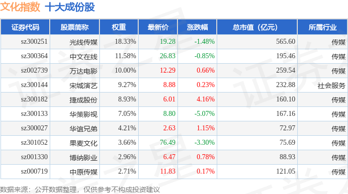 文化指数(399248)十大成份股详情如下: