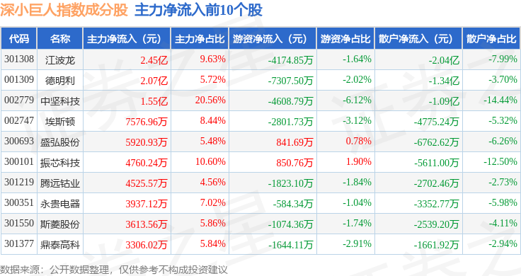 资金流向方面,深小巨人(399268)指数成份股当日主力资金净流出合计14.86亿元,游资资金净流出合计1.05亿元,散户资金净流入合计15.91亿元。成份股资金流向详情见下表: