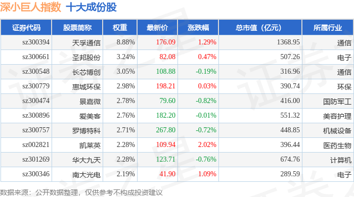 深小巨人(399268)指数十大成份股详情如下: