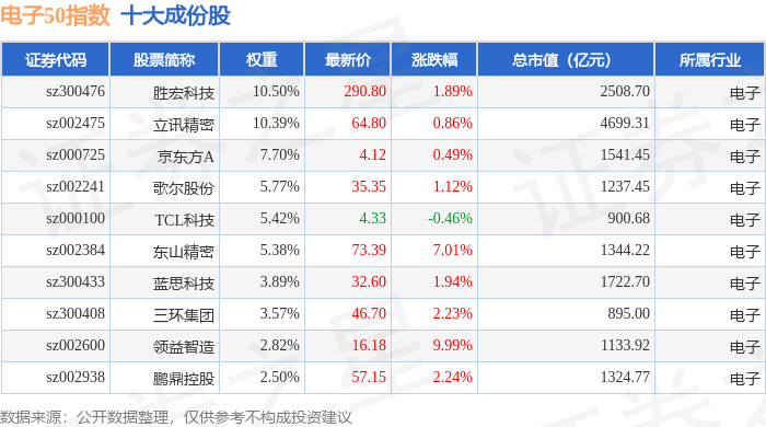 证券之星消息,9月29日,电子50(399281)指数报收于4760.09点,涨2.11%,成交1116.53亿元,换手率3.54%。当日该指数成份股中,上涨的有38家,协创数据以12.25%的涨幅领涨,下跌的有12家,长信科技以4.73%的跌幅领跌。