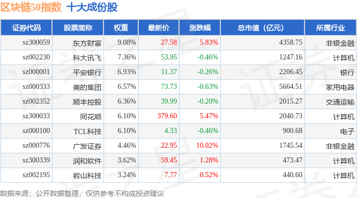 证券之星消息,9月29日,区块链50(399286)指数报收于4240.95点,涨1.62%,成交837.95亿元,换手率3.42%。当日该指数成份股中,上涨的有33家,广发证券以10.02%的涨幅领涨,下跌的有15家,省广集团以2.47%的跌幅领跌。
