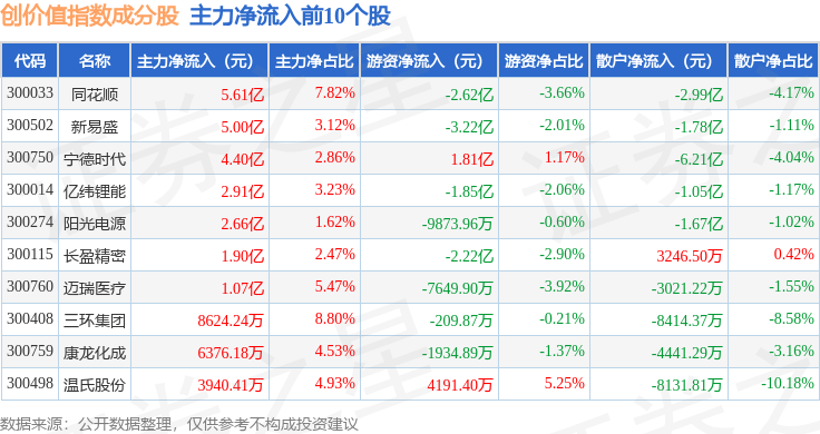 资金流向方面,创价值(399295)指数成份股当日主力资金净流入合计7.38亿元,游资资金净流出合计7.77亿元,散户资金净流入合计3860.72万元。成份股资金流向详情见下表: