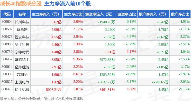 资金流向方面,成长40(399326)指数成份股当日主力资金净流入合计29.72亿元,游资资金净流出合计8.07亿元,散户资金净流出合计21.66亿元。成份股资金流向详情见下表: