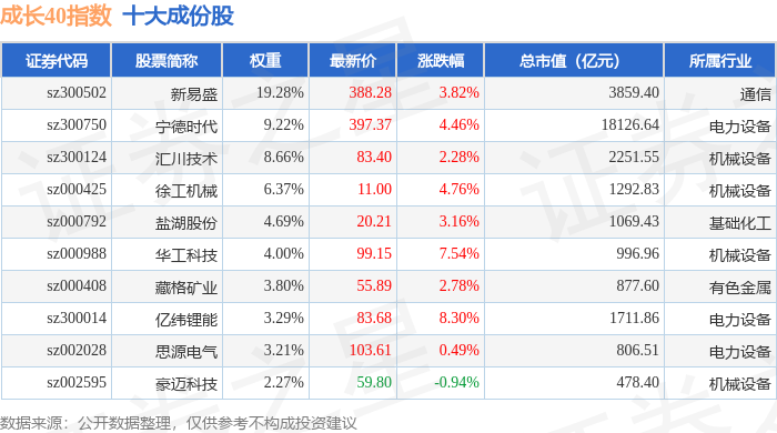 成长40(399326)指数十大成份股详情如下: