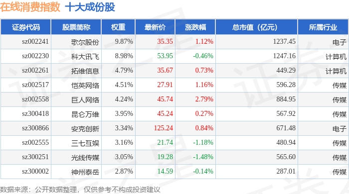 证券之星消息,9月29日,在线消费(399361)指数报收于4184.59点,涨0.57%,成交408.16亿元,换手率3.46%。当日该指数成份股中,上涨的有29家,电广传媒以4.82%的涨幅领涨,下跌的有21家,中公教育以1.78%的跌幅领跌。