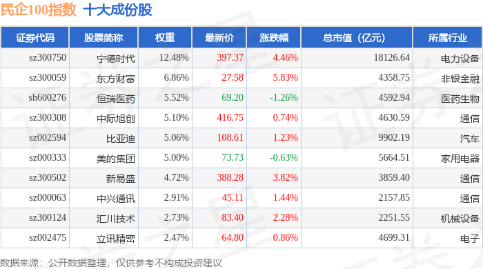 证券之星消息,9月29日,民企100(399362)指数报收于8906.63点,涨2.14%,成交2645.51亿元,换手率2.35%。当日该指数成份股中,上涨的有73家,亿纬锂能以8.3%的涨幅领涨,下跌的有25家,亚翔集成以4.02%的跌幅领跌。