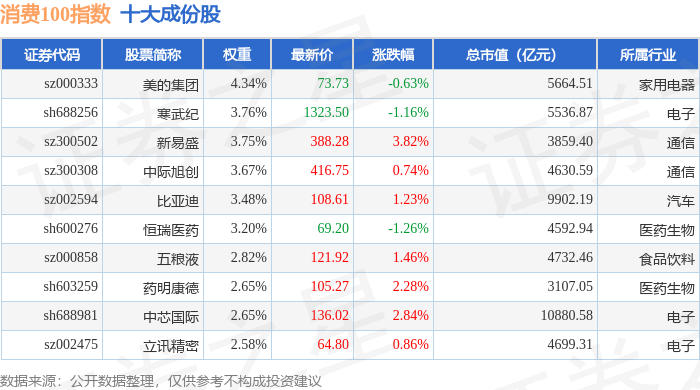 消费100(399364)指数十大成份股详情如下: