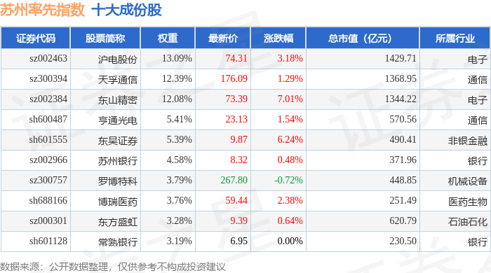 证券之星消息,9月29日,苏州率先(399410)指数报收于2751.75点,涨2.22%,成交340.78亿元,换手率2.65%。当日该指数成份股中,上涨的有21家,东山精密以7.01%的涨幅领涨,下跌的有8家,天顺风能以1.45%的跌幅领跌。