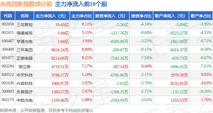 资金流向方面,央视创新(399551)指数成份股当日主力资金净流出合计12.51亿元,游资资金净流出合计7.88亿元,散户资金净流入合计20.39亿元。成份股资金流向详情见下表:
