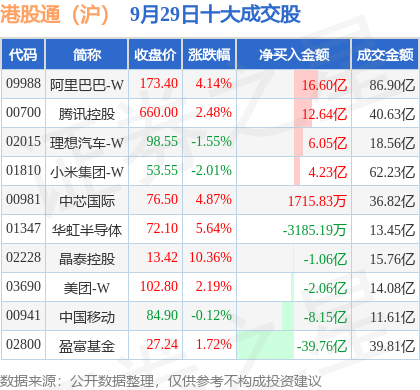 证券之星消息,9月29日,恒生指数涨1.89%,报收26622.88点。当日南向资金净卖出16.54亿港元,交易所公布的港股通(沪)十大成交股中,净买入个股共5只,净买入金额最多的是阿里巴巴-W,净买入16.6亿港元,净卖出个股共5只,净卖出金额最多的是盈富基金,净卖出39.76亿港元。详情可见下表: