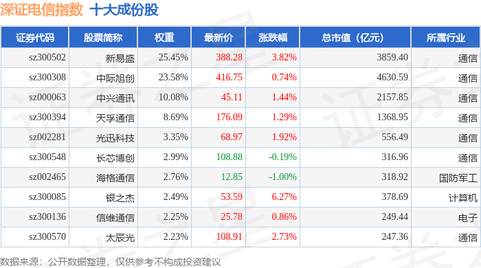 证券之星消息,9月29日,深证电信(399621)指数报收于10620.52点,涨1.67%,成交634.91亿元,换手率3.55%。当日该指数成份股中,上涨的有14家,银之杰以6.27%的涨幅领涨,下跌的有9家,兆龙互连以4.48%的跌幅领跌。