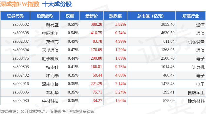 证券之星消息,9月29日,深成指EW(399659)指数报收于4619.65点,涨1.71%,成交6792.94亿元,换手率2.26%。当日该指数成份股中,上涨的有344家,湖南裕能以18.29%的涨幅领涨,下跌的有140家,无线传媒以7.6%的跌幅领跌。