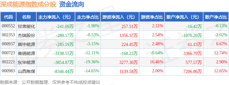 资金流向方面,深成能源(399680)指数成份股当日主力资金净流出合计1.62亿元,游资资金净流入合计6086.98万元,散户资金净流入合计1.01亿元。成份股资金流向详情见下表: