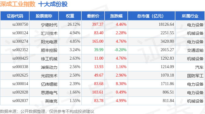 证券之星消息,9月29日,深成工业(399682)指数报收于1907.74点,涨3.03%,成交1658.49亿元,换手率2.79%。当日该指数成份股中,上涨的有78家,湖南裕能以18.29%的涨幅领涨,下跌的有28家,先导智能以3.59%的跌幅领跌。