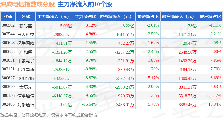 资金流向方面,深成电信(399688)指数成份股当日主力资金净流出合计8.87亿元,游资资金净流入合计1.46亿元,散户资金净流入合计7.41亿元。成份股资金流向详情见下表: