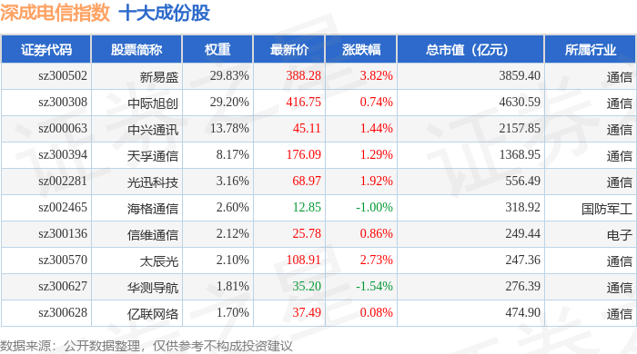 证券之星消息,9月29日,深成电信(399688)指数报收于5589.03点,涨1.71%,成交536.38亿元,换手率3.29%。当日该指数成份股中,上涨的有10家,新易盛以3.82%的涨幅领涨,下跌的有5家,华测导航以1.54%的跌幅领跌。