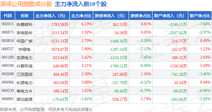 资金流向方面,深成公用(399689)指数成份股当日主力资金净流出合计2850.63万元,游资资金净流出合计322.57万元,散户资金净流入合计3173.19万元。成份股资金流向详情见下表: