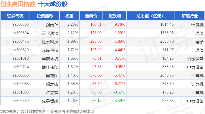 证券之星消息,9月29日,创业高贝(399694)指数报收于4173.17点,涨2.03%,成交1817.7亿元,换手率4.79%。当日该指数成份股中,上涨的有72家,协创数据以12.25%的涨幅领涨,下跌的有28家,易点天下以5.71%的跌幅领跌。