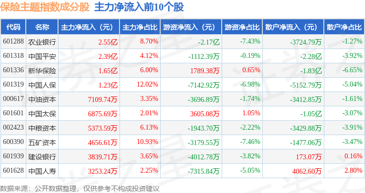 资金流向方面,保险主题(399809)指数成份股当日主力资金净流入合计5.48亿元,游资资金净流出合计1.19亿元,散户资金净流出合计4.29亿元。成份股资金流向详情见下表: