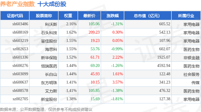 证券之星消息,9月29日,养老产业(399812)指数报收于6538.66点,跌0.02%,成交443.45亿元,换手率0.98%。当日该指数成份股中,上涨的有44家,东方明珠以3.57%的涨幅领涨,下跌的有34家,无线传媒以7.6%的跌幅领跌。