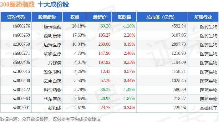 证券之星消息,9月29日,300医药(399913)指数报收于9438.48点,涨0.28%,成交227.38亿元,换手率0.88%。当日该指数成份股中,上涨的有15家,康龙化成以3.78%的涨幅领涨,下跌的有9家,百利天恒以2.7%的跌幅领跌。