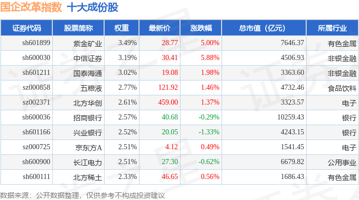 证券之星消息,9月29日,国企改革(399974)指数报收于1901.32点,涨1.44%,成交1965.68亿元,换手率0.97%。当日该指数成份股中,上涨的有69家,广发证券以10.02%的涨幅领涨,下跌的有27家,紫光国微以1.8%的跌幅领跌。
