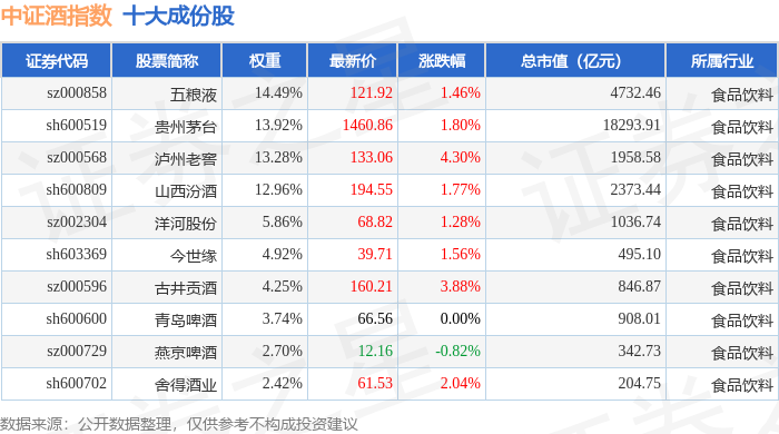 中证酒(399987)指数十大成份股详情如下: