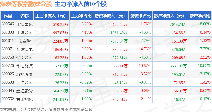 资金流向方面,煤炭等权(399990)指数成份股当日主力资金净流出合计5.32亿元,游资资金净流出合计1.1亿元,散户资金净流入合计6.42亿元。成份股资金流向详情见下表: