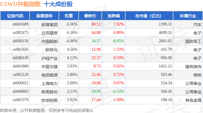 CSWD并购(399992)指数十大成份股详情如下: