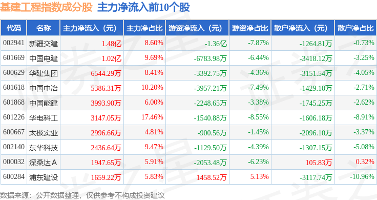 资金流向方面,基建工程(399995)指数成份股当日主力资金净流入合计1.3亿元,游资资金净流出合计3.55亿元,散户资金净流入合计2.24亿元。成份股资金流向详情见下表: