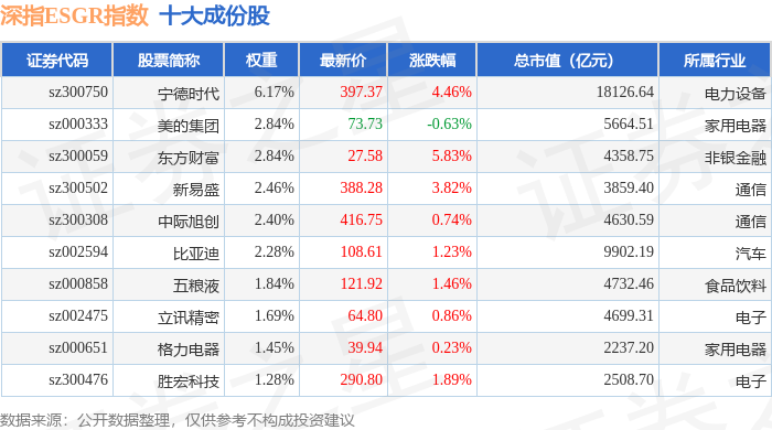 证券之星消息,9月29日,深指ESGR(470026)指数报收于19299.17点,涨2.04%,成交5823.56亿元,换手率2.18%。当日该指数成份股中,上涨的有284家,协创数据以12.25%的涨幅领涨,下跌的有106家,长信科技以4.73%的跌幅领跌。