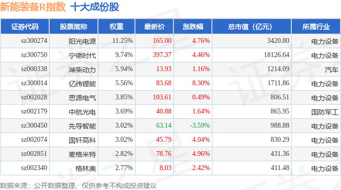 资金流向方面,新能装备R(470043)指数成份股当日主力资金净流出合计3.3亿元,游资资金净流出合计5.12亿元,散户资金净流入合计8.42亿元。成份股资金流向详情见下表: