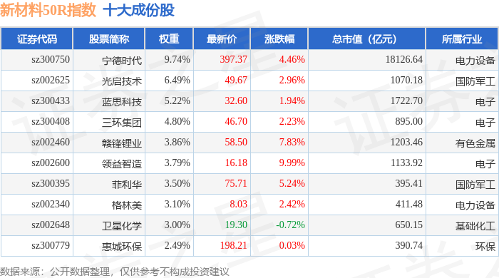证券之星消息,9月29日,新材料50R(470042)指数报收于4006.58点,涨3.34%,成交939.1亿元,换手率4.31%。当日该指数成份股中,上涨的有39家,天赐材料以10.01%的涨幅领涨,下跌的有11家,长信科技以4.73%的跌幅领跌。