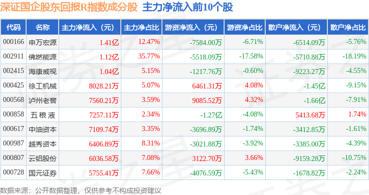 资金流向方面,深证国企股东回报R(470064)指数成份股当日主力资金净流入合计5.43亿元,游资资金净流出合计4.13亿元,散户资金净流出合计1.3亿元。成份股资金流向详情见下表: