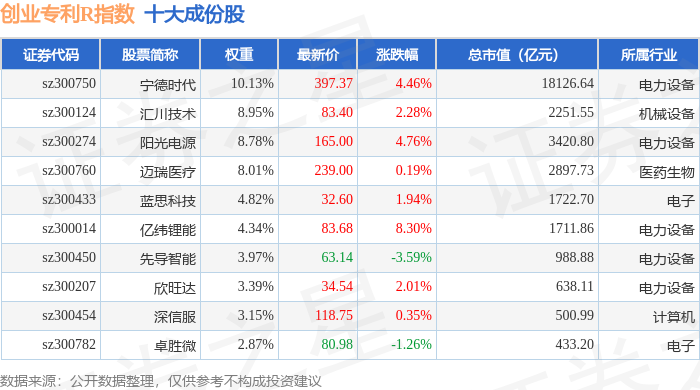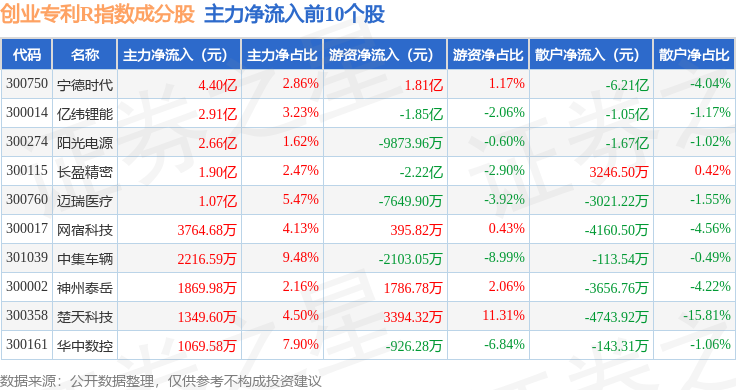 资金流向方面,创业专利R(470068)指数成份股当日主力资金净流出合计14.51亿元,游资资金净流入合计3.68亿元,散户资金净流入合计10.84亿元。成份股资金流向详情见下表: