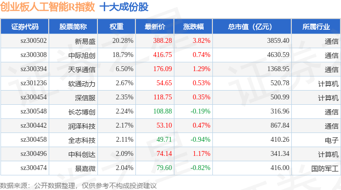 创业板人工智能R(470070)指数十大成份股详情如下: