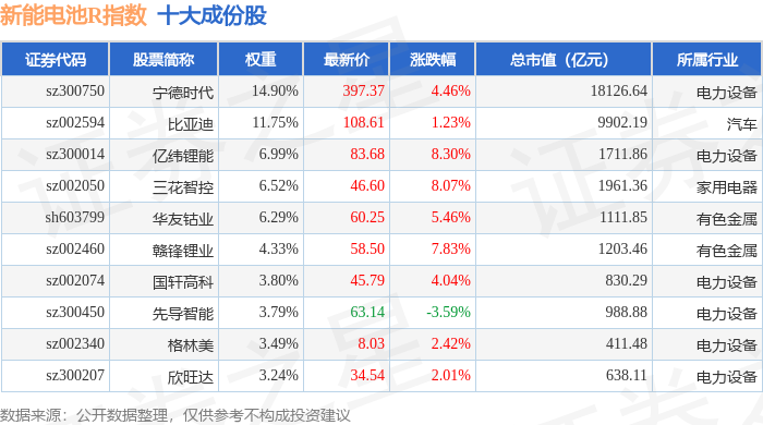 新能电池R(480032)指数十大成份股详情如下: