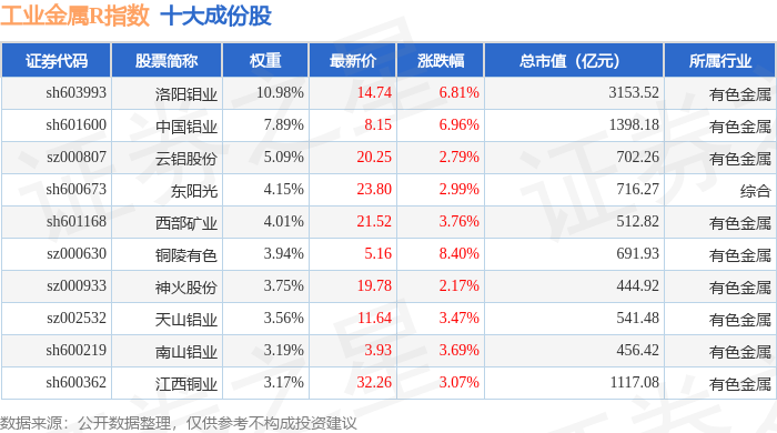 工业金属R(480043)指数十大成份股详情如下: