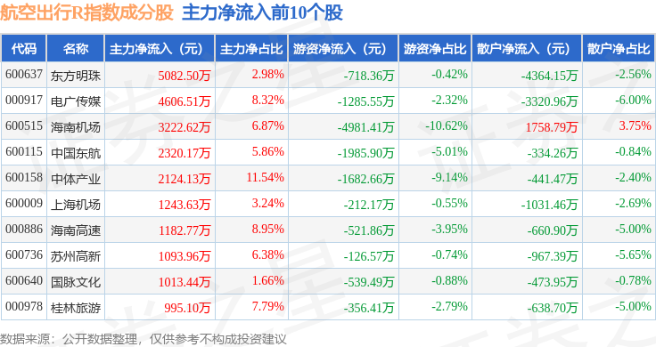 资金流向方面,航空出行R(480059)指数成份股当日主力资金净流出合计3.21亿元,游资资金净流出合计4735.65万元,散户资金净流入合计3.68亿元。成份股资金流向详情见下表: