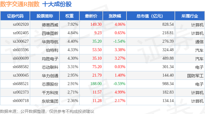 证券之星消息,9月29日,数字交通R(480075)指数报收于3613.58点,涨1.21%,成交304.1亿元,换手率1.97%。当日该指数成份股中,上涨的有38家,经纬恒润以5.13%的涨幅领涨,下跌的有12家,莱斯信息以3.08%的跌幅领跌。