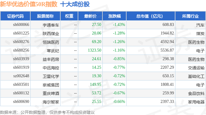 新华优选价值50R(489004)指数十大成份股详情如下: