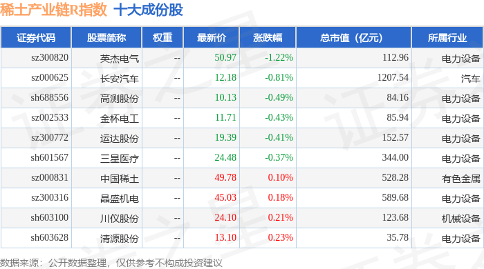 证券之星消息,9月29日,稀土产业链R(489013)指数报收于4006.68点,涨3.21%,成交1094.11亿元,换手率2.69%。当日该指数成份股中,上涨的有44家,上能电气以8.94%的涨幅领涨,下跌的有6家,英杰电气以1.22%的跌幅领跌。