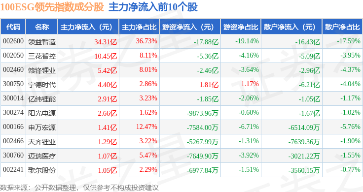 资金流向方面,100ESG领先(970030)指数成份股当日主力资金净流入合计48.07亿元,游资资金净流出合计20.13亿元,散户资金净流出合计27.94亿元。成份股资金流向详情见下表: