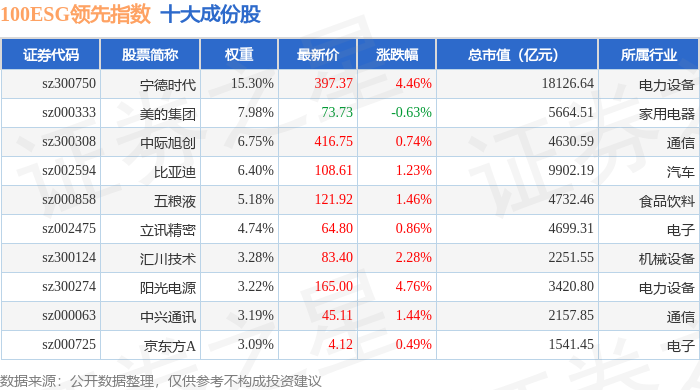 证券之星消息,9月29日,100ESG领先(970030)指数报收于6689.7点,涨2.19%,成交1838.91亿元,换手率1.81%。当日该指数成份股中,上涨的有38家,领益智造以9.99%的涨幅领涨,下跌的有11家,新产业以1.83%的跌幅领跌。