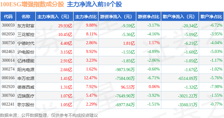 资金流向方面,100ESG增强(970033)指数成份股当日主力资金净流入合计46.08亿元,游资资金净流出合计9.74亿元,散户资金净流出合计36.34亿元。成份股资金流向详情见下表: