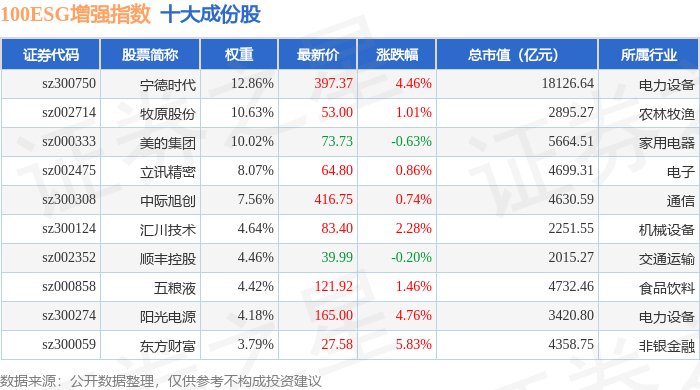 100ESG增强(970033)指数十大成份股详情如下: