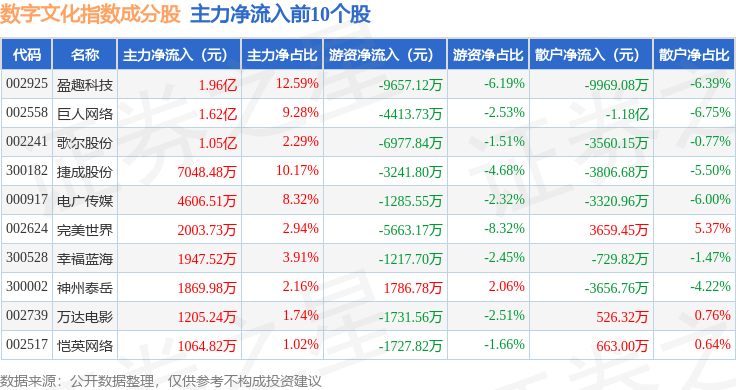 资金流向方面,数字文化(970047)指数成份股当日主力资金净流出合计2.57亿元,游资资金净流出合计1.95亿元,散户资金净流入合计4.52亿元。成份股资金流向详情见下表: