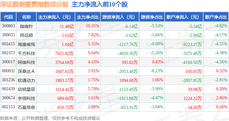资金流向方面,深证数据要素(970053)指数成份股当日主力资金净流入合计2.31亿元,游资资金净流出合计8.24亿元,散户资金净流入合计5.93亿元。成份股资金流向详情见下表: