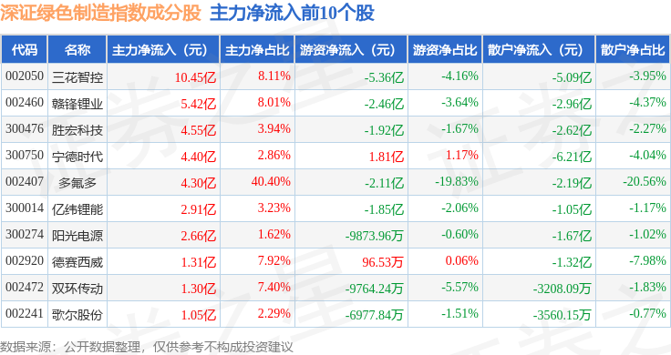 资金流向方面,深证绿色制造(970069)指数成份股当日主力资金净流入合计26.39亿元,游资资金净流出合计9.31亿元,散户资金净流出合计17.08亿元。成份股资金流向详情见下表: